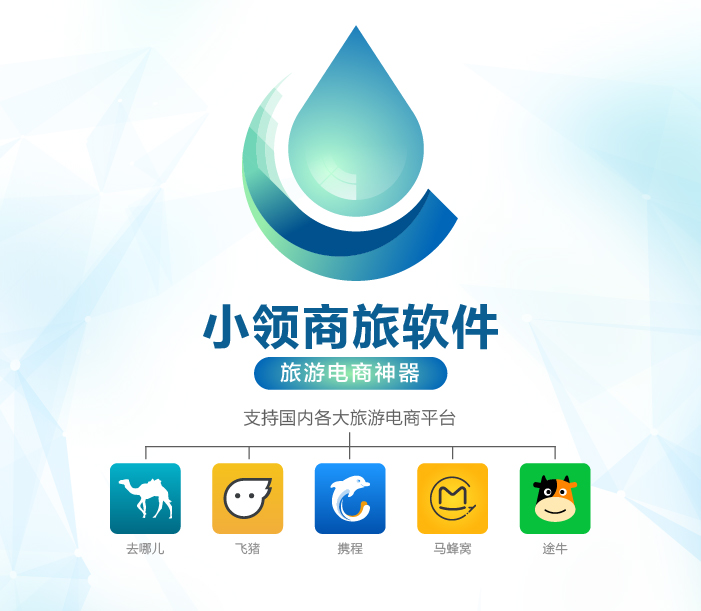 小領(lǐng)商旅軟件,旅游電商神器,國內(nèi)各大旅游電商平臺(去哪兒,攜程,途牛,飛豬,螞蜂窩...)均可支持:機票集成,價格更新,排名分析,價格對比,做電商就是這么容易!。